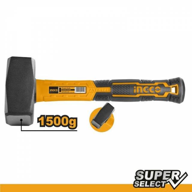 Kovové kladivo z uhlíkovej ocele – pucka, pogumovaná rukoväť, sklolaminátová rúčka, hmotnosť 1500g